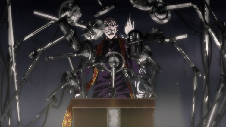 X/死ぬために戦場を歩き続ける半世紀前の亡霊、最後の大隊。かつての盟友、ウォルターと対峙する吸血鬼、アーカード。戦局は収束へと向かい、残された者たちが残された者たちと最後の死闘を繰り広げる。ただひとり戦場を静観する少佐は自らの勝利を確信する。そして自らを殺しに現れた宿敵、インテグラを歓迎するのだった。【提供:バンダイチャンネル】