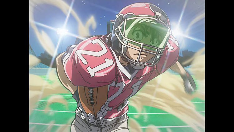 第1話 光速の脚をもつ男/気弱で引っ込み思案な性格の小早川瀬那は、いじめられるのを避けるためパシリ人生を送ってきた。高校入学を機にそんな自分を変えようと、アメフト部に主務としての入部を決意するが、そんなセナのパシリで鍛えたスピードに蛭魔妖一が目をつけ…【提供:バンダイチャンネル】