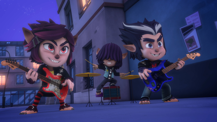 #202 「うたの たたかい」/オオカミ団がバンドを組み、夜の町で歌っている。あまりのひどい歌声に、ルナ・ガールはボードから転がり落ち、ニンジャたちは逃げ出した。