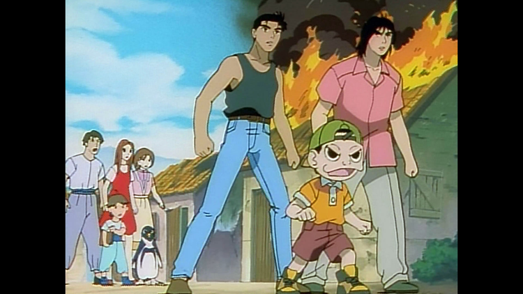 第1話 子忍の風助!/幼い頃、謎の男にさらわれた母を探す風助は、友だちのペンギン・ヒロユキと旅をする途中、パン屋の娘・美香と仲良くなる。そんな中、美香が、ニセ忍空の辰巳にさらわれる。彼女を助けに向かった風助は、そこで橙次の妹・里穂子に出会うのだった。【提供:バンダイチャンネル】