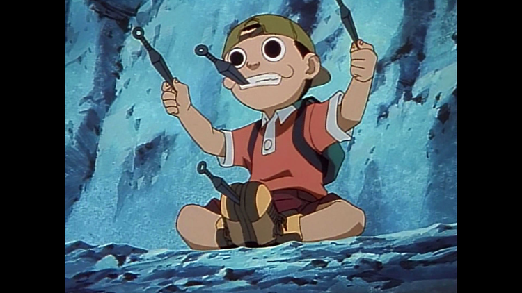 第1話 子忍の風助!/幼い頃、謎の男にさらわれた母を探す風助は、友だちのペンギン・ヒロユキと旅をする途中、パン屋の娘・美香と仲良くなる。そんな中、美香が、ニセ忍空の辰巳にさらわれる。彼女を助けに向かった風助は、そこで橙次の妹・里穂子に出会うのだった。【提供:バンダイチャンネル】
